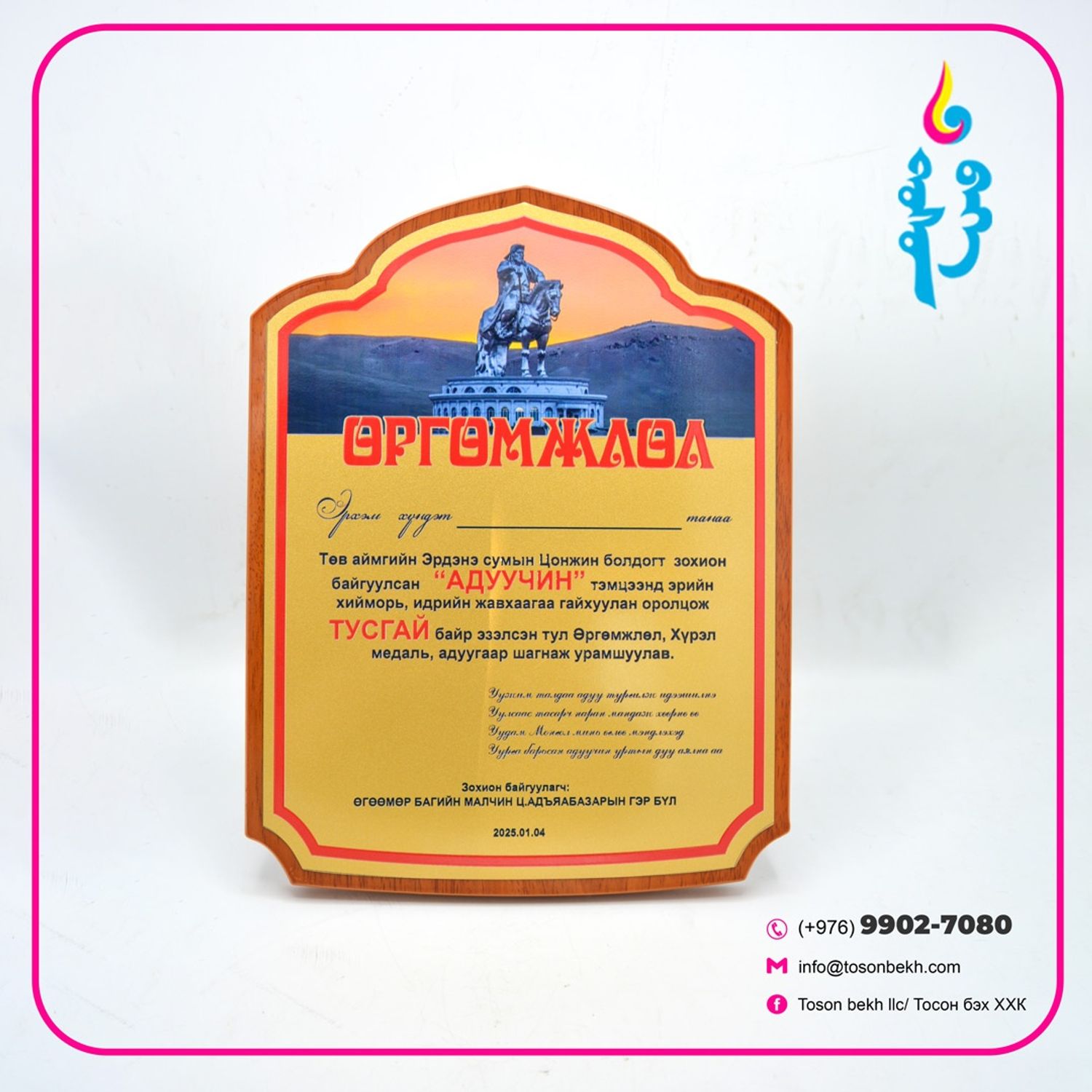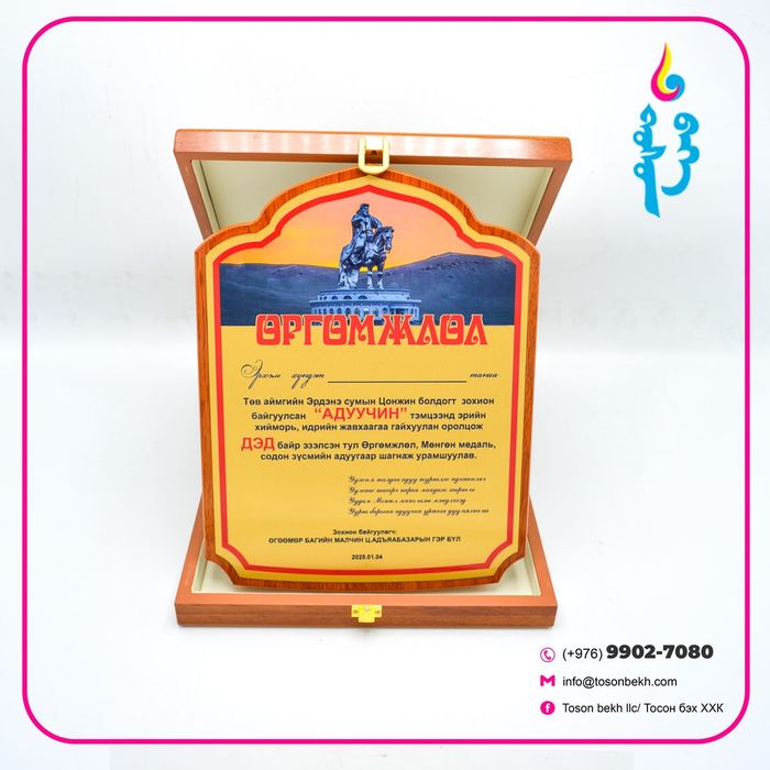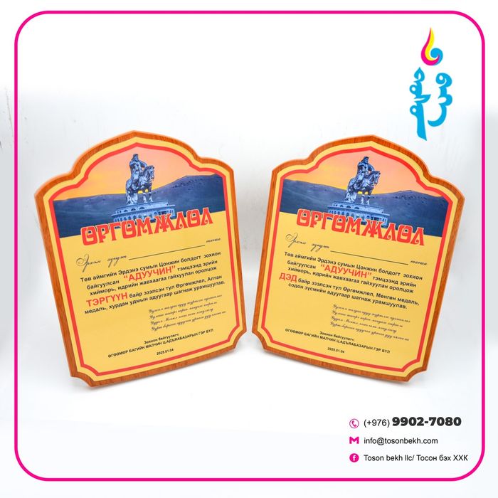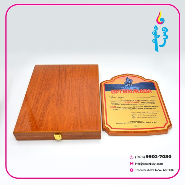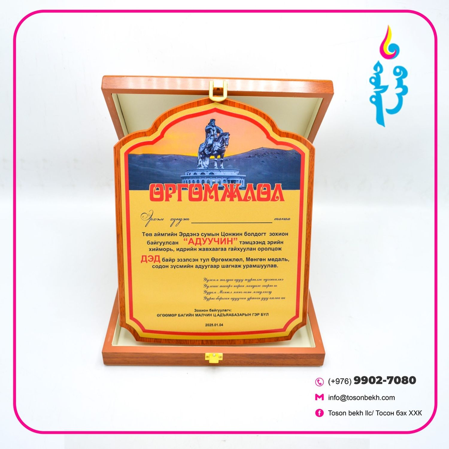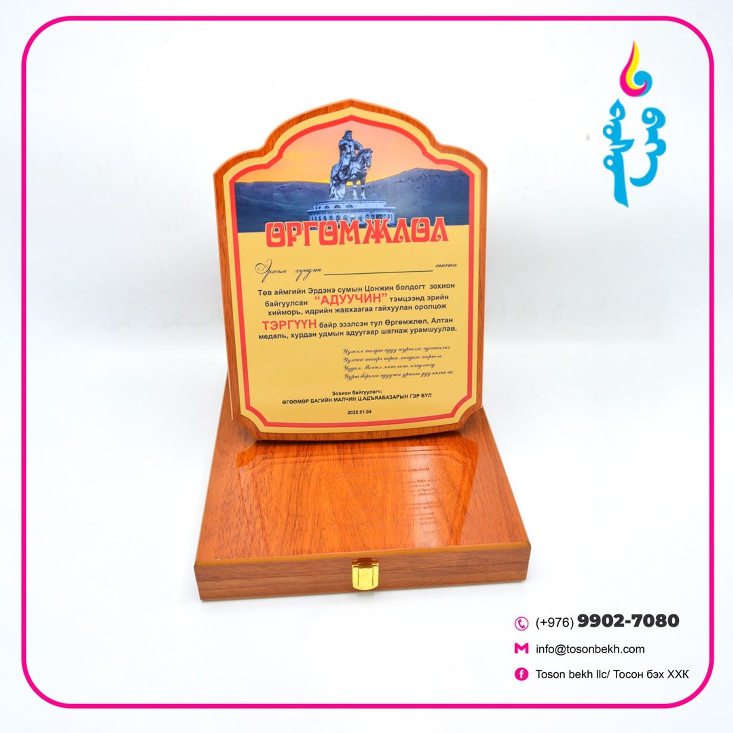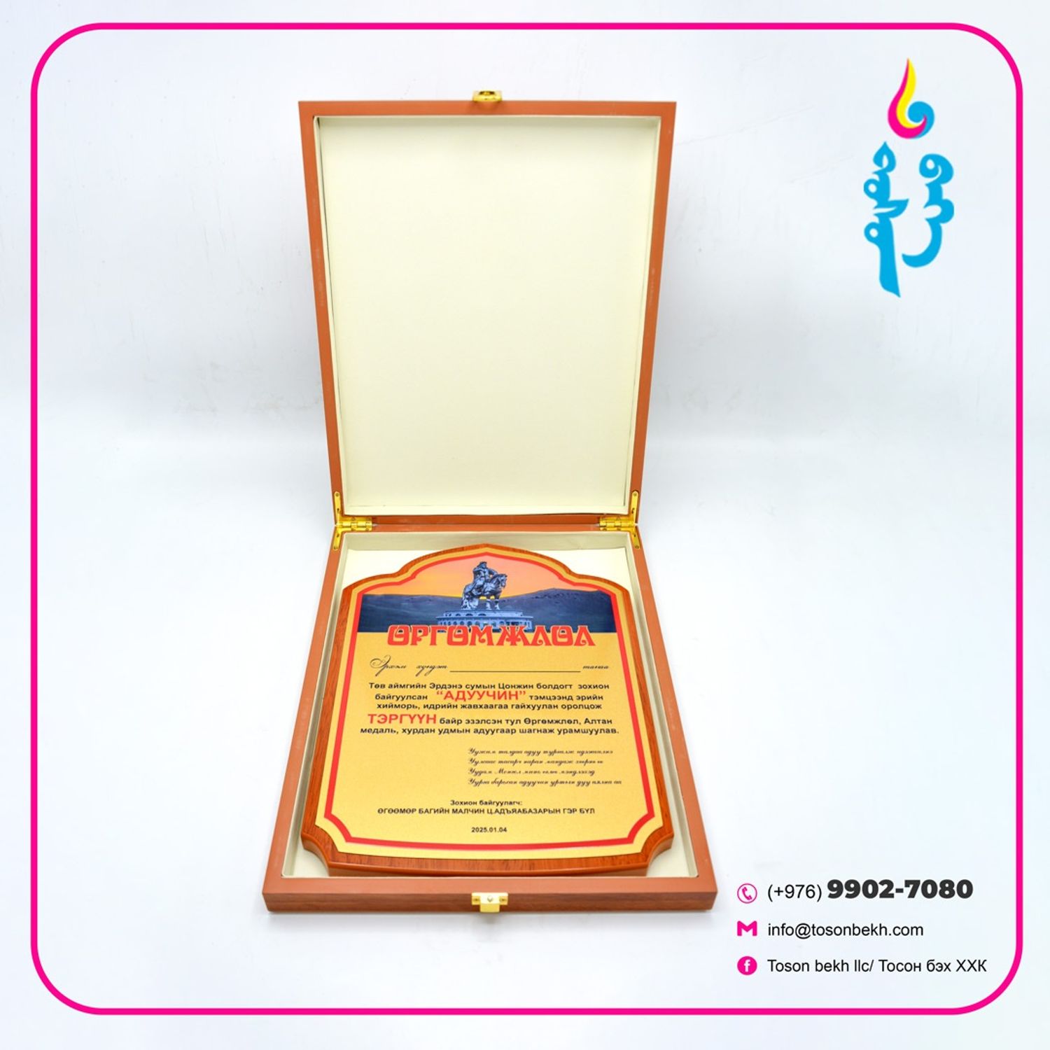 Өөрийн хүссэн загвараа UV хэвлэл болон алтлаг, мөнгөлөг төмөр хэвлэл, алтлаг, мөнгөлөг флонкон хэвлэл, лазер ухалтаар хийлгэн авах боломжтой. Хэвлэлийн үнэ болон НӨАТ багтсан болно.